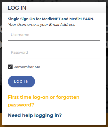 New users must click the link in the log on pop up that says "First time log-on or forgotten password?". This link is used to setup your log on password. When you click the link you will be directed to MedicNET. Enter your email address. If you see a green check mark, your email is valid in the system.