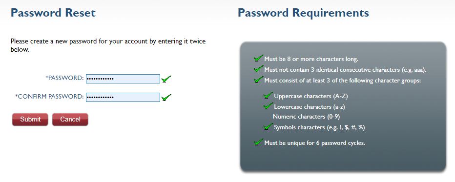 The rules for your password will be shown to the right. As you enter your password and meet the various rules the corisponding rule will show a green check mark to show that you have met the requirement. Once all rules have been maked as met you can submit your password change.