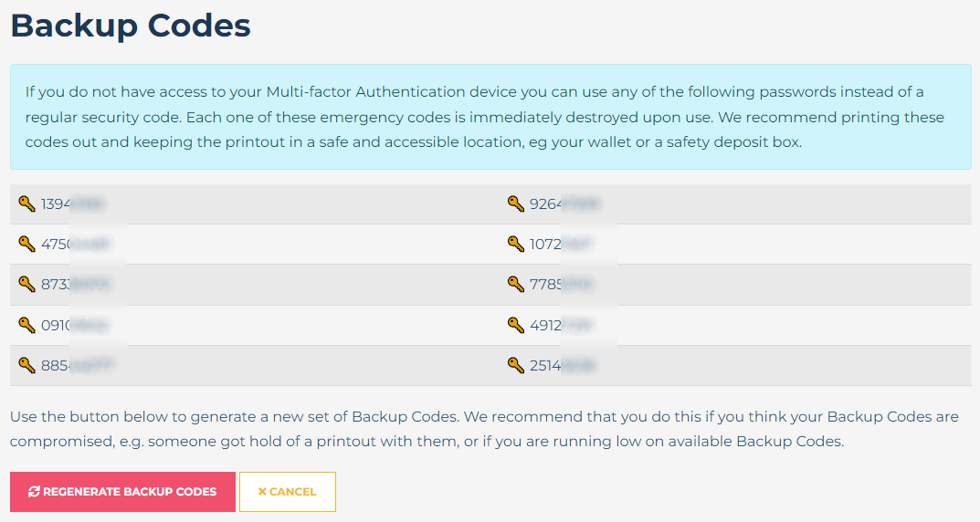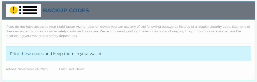 These codes are located in your Profile under Multi-factor Authentication. You can access your profile once logged in under Home - Login - Edit Profile