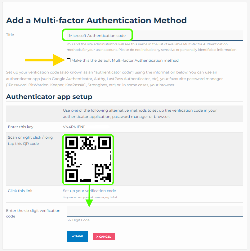 - Enter a Title for this MFA method, I’ve named it Microsoft Authentication code so it will be easier to identify when I login.